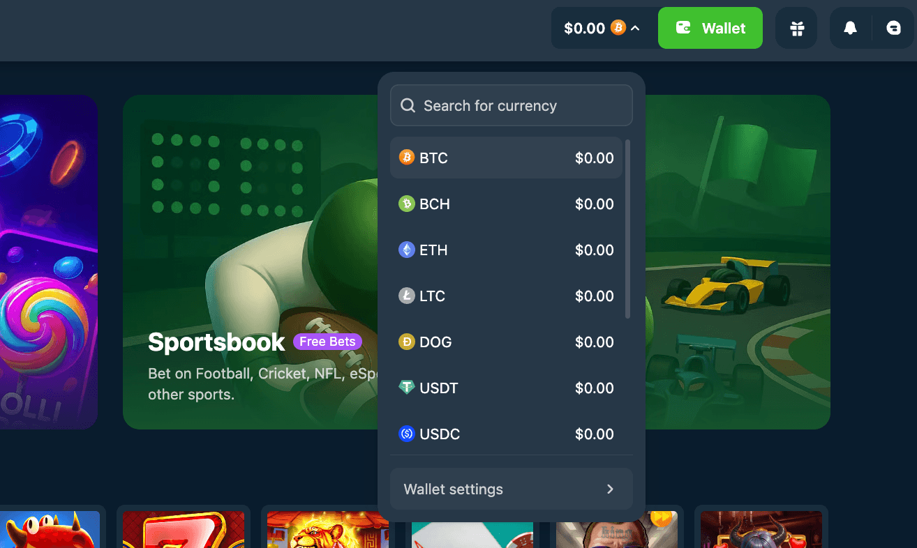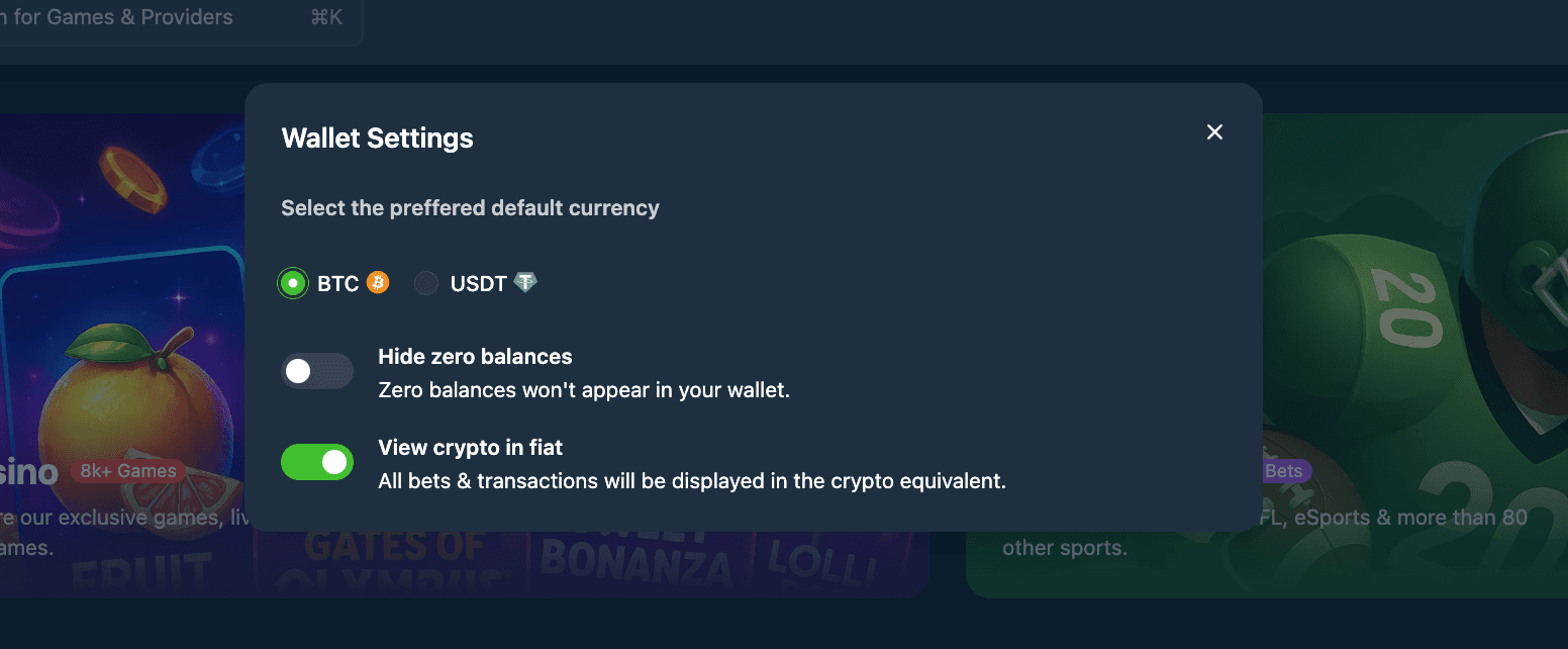 From Wallet Settings, you can choose your preferred default currency and activate the “View crypto in fiat” button if you wish to see the bets and transactions in fiat currency, or hide zero balances to keep your wallet view clean.