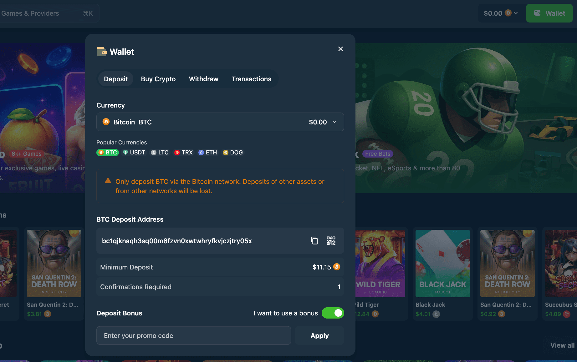 Once you are a Wild.io member, the first thing you should do is make a deposit into your account. Making a deposit is a breeze, especially when you can choose between several cryptocurrencies. At Wild.io, you can deposit in BTC, BCH, ETH, LTC, DOG, USDT, USDC, XRP, ADA, TRX, BNB, and SOL.