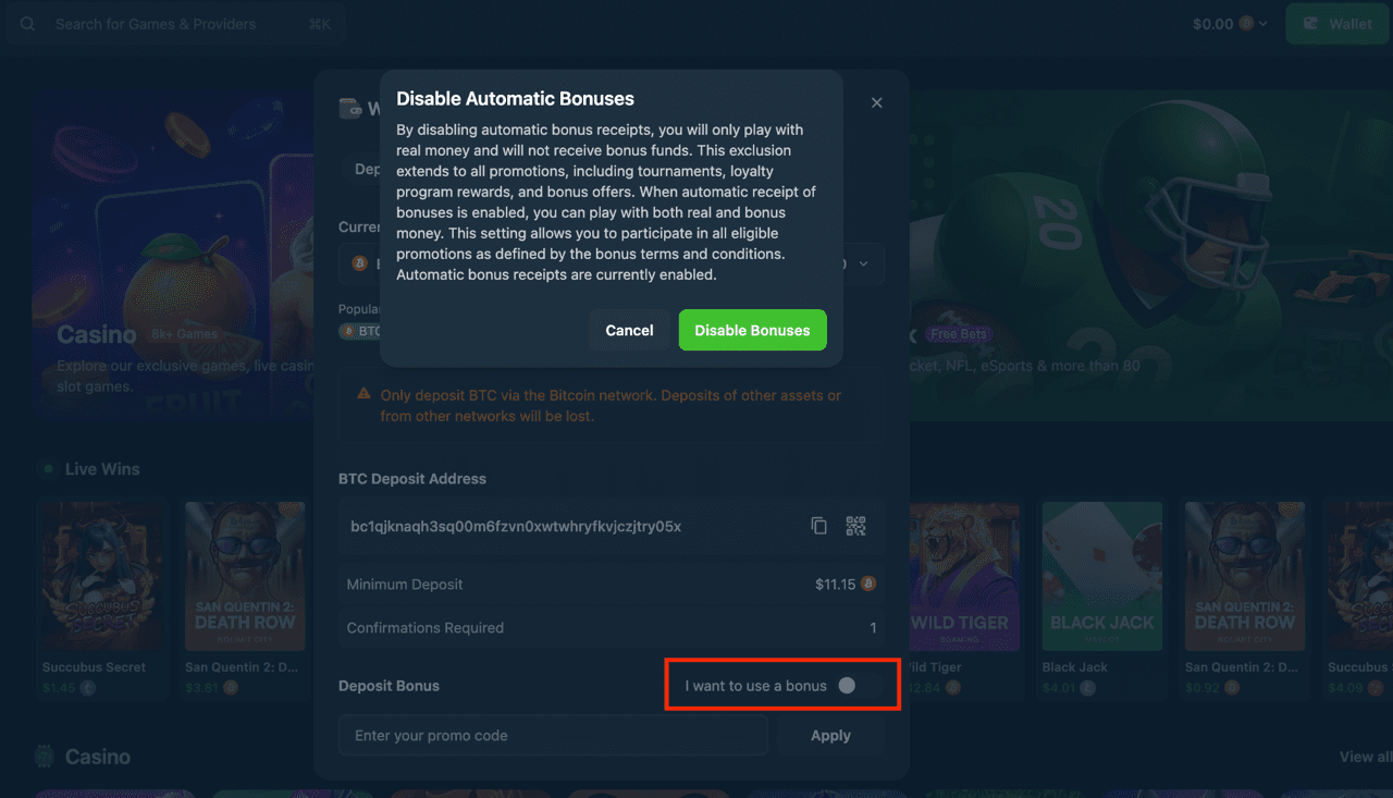 However, if you want to use any of the bonuses available, make sure you toggle the “I want to use a bonus” on before making the deposit.