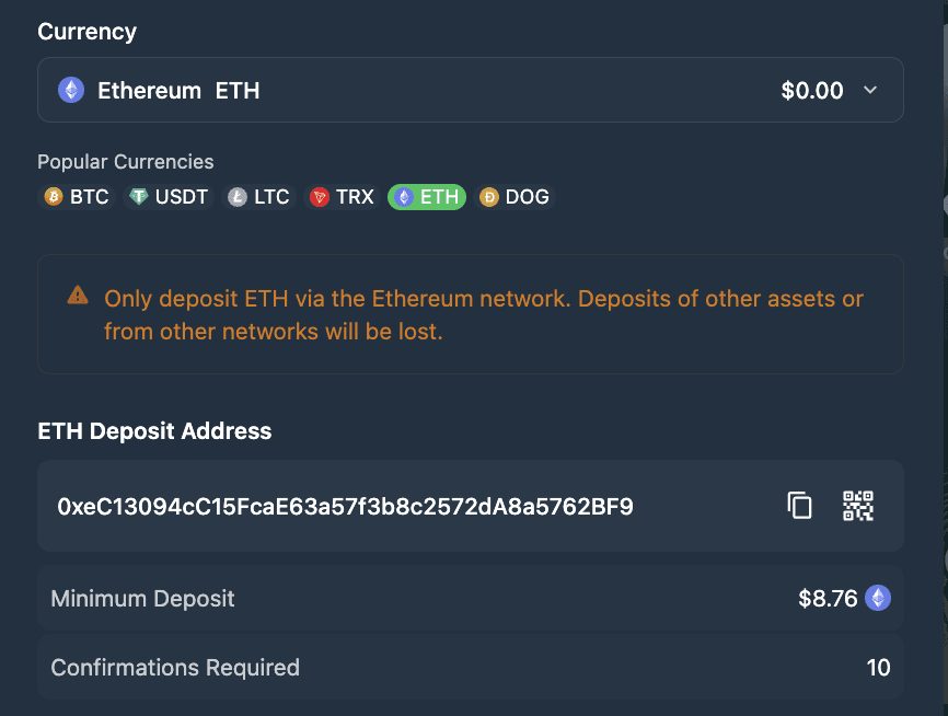 Make a deposit to Wild.io by transferring your desired amount to your unique Wild.io account address.
